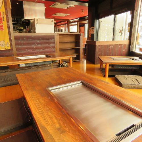 【掘りごたつ席】木の温もりが感じられる落ち着いた空間で、お食事をお楽しみください。全席の鉄板は、お好み焼きをアツアツのままキープできます。最後まで美味しく召し上がっていただけます。座面が広い掘りごたつ式のお席は、お子様連れやご年配の方にも好評です!お子様用の食器もご用意しております。